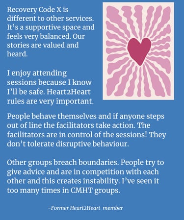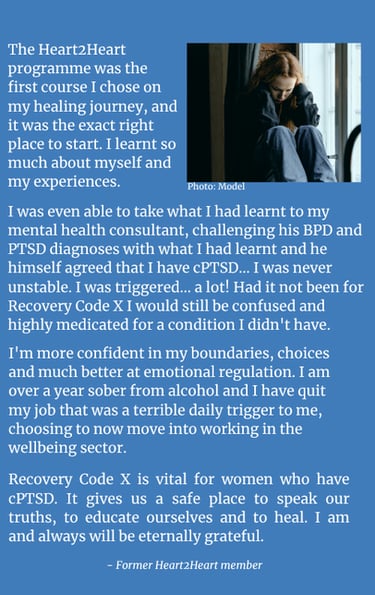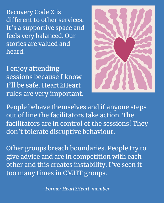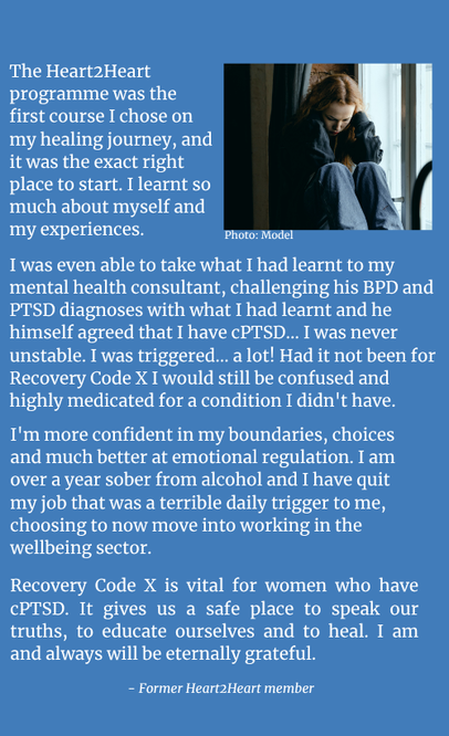 The sessions will be run by two specially trained, experienced Recovery Code X facilitators. As well as providing a space for sharing experiences and challenges, the sessions will offer psycho education and insight into the neurobiology of trauma to help us make sense of our experience, as well as coping tools and relaxation techniques.